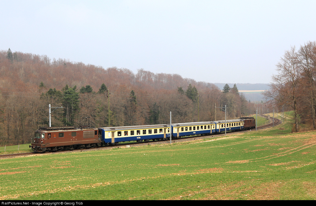 | A charter train with Re 4/4 179 and 185 top and tail for a group of "kilometre collectors" of the UK is on the way on a very unknown line: the 4.72 kilometre long branch line to the army training camp of Bure belongs to the Swiss Confederation and has a maximum grade of 4.5 %. There is no regular passenger nor freight service on the line, only rare specials for the army.