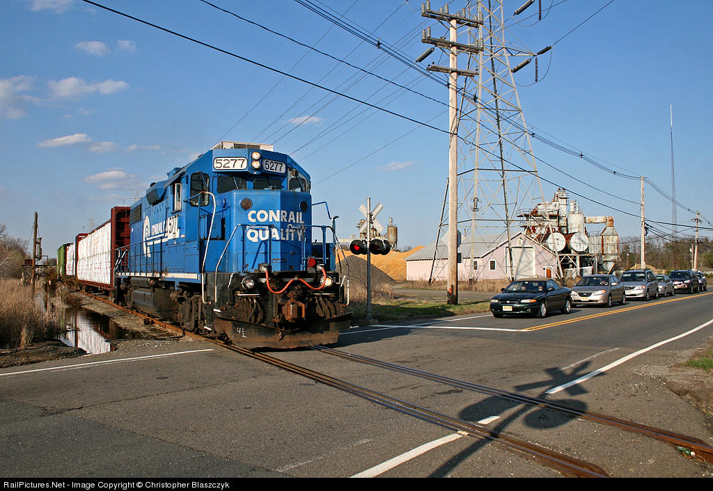 | Ten years after. Rush hour traffic backs up at the Asbury Road crossing as NS 5277 and three loads slowly roll sotuhward down the former Central of New Jersey, now Conrail Shared Assets' Southern Secondary. |