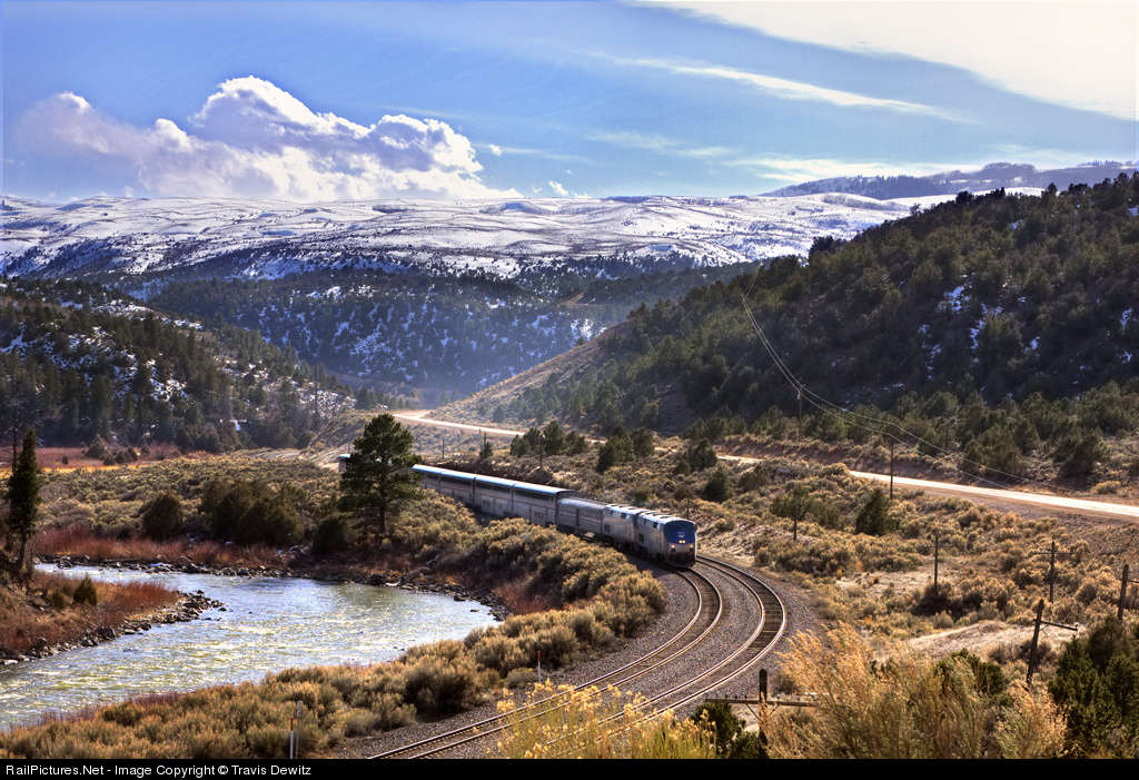 | Amtrak's California Zephyr heads east along the Colorado River late in the day just outside State Bridge, CO. As the name states, that is what State Bridge is. State Road 131 bridge over the Colorado River with a few structures and a campground. The locomotives throttle up and kick out some exhaust that fills the air as it rounds one of the many bends of the famous Moffat Route. |