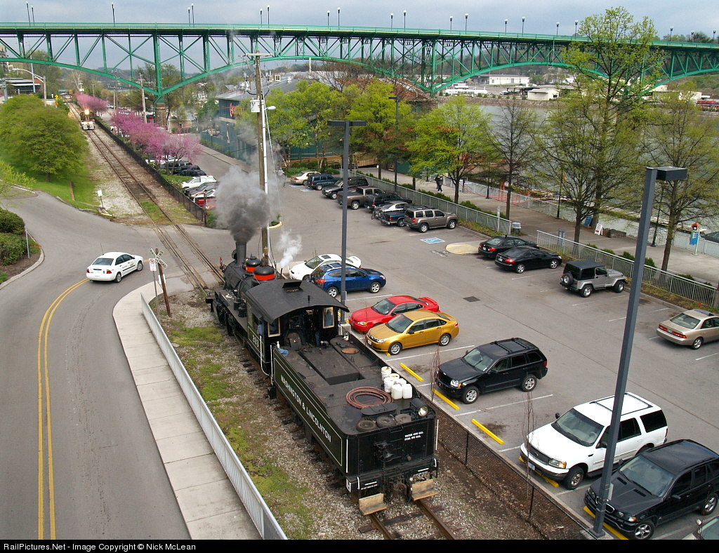 From a pedestrian overpass, we see 203 backing down to the 5pm Easter Bunny Express of the Three Rivers Rambler. A close look down the tracks shows KXHR's Chattanooga Traction Co. SW1 #4 following the 203 to the waterfront. The 3RR crew was testing burning diesel in 203 today and had steaming troubles on the 2pm run to Marbledale. The SW1 followed the 5pm train and eventually had to shove the consist up the final hill into Marbledale from the Holston River. Fortunately, the 203 had a fresh load of waste oil, it’s usual fuel, for Sunday’s trips and performed admirably.