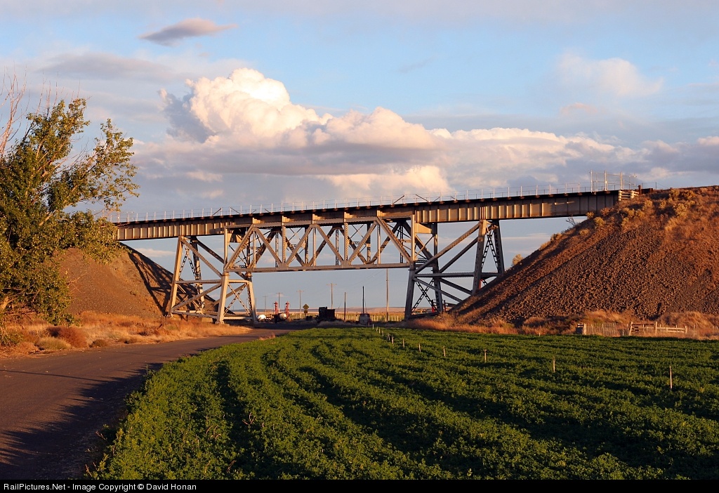 Where once there were two, now there are none: Last light on an autumn evening washes across the abandoned SP&S bridge in Washtucna, Washington and the small patch of crops planted below it. Just about where I stood to capture this portrait -- perhaps even unintentionally staked out by the row of sprinkler heads -- lies the centerline of an abandoned UP branch that once ran through Washtucna Coulee to connect Connell and Hooper Junction. Washtucna is symbolic of many locations in Eastern Washington, a region which once hosted an incredible network of rail lines that served the bountiful Palouse; most of the branches and two mainlines that crossed this arid land have since been abandoned, leaving behind only lonely relics of past engineering feats, dusty trails and the occasional spread recycled by humans for another purpose.