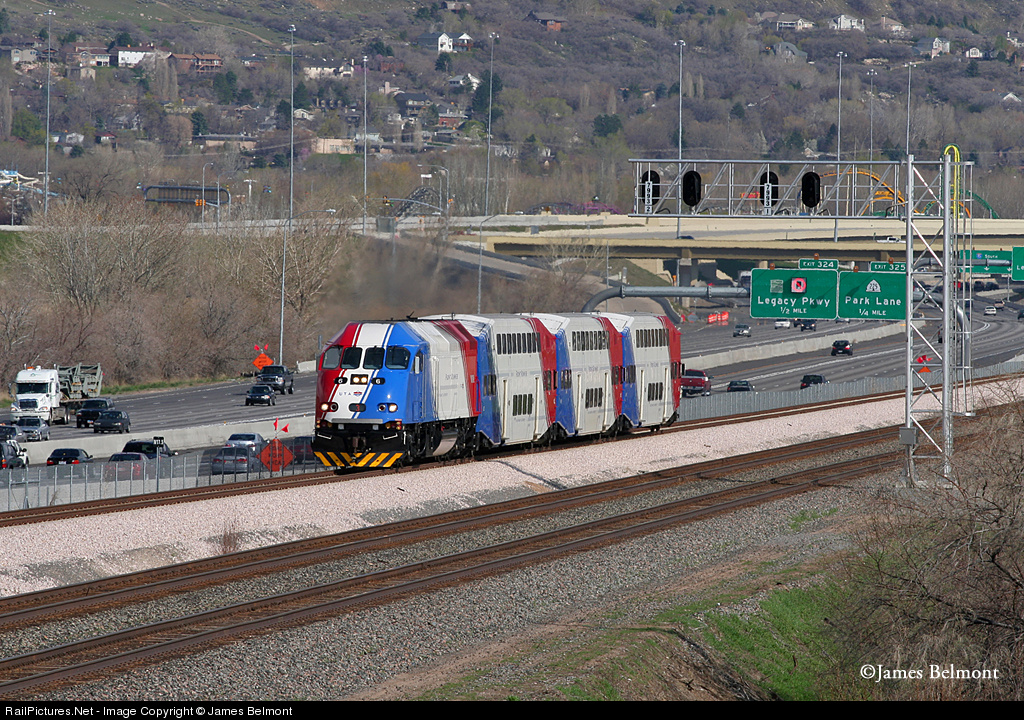 | A UTA FrontRunner commute accelerates up to track speed just north of the Farmington station stop. The train is climbing the Cherry Hill grade approaching the town of Kaysville. Davis County's transportation corridor through this region is sandwiched between the Wasatch Front on the east and the Great Salt Lake on the west. Interstate 15 is on the left, and Union Pacific's Salt Lake to Ogden double track mainline is at right. |