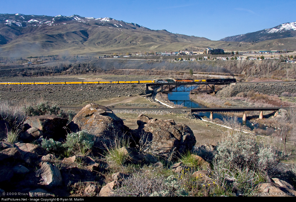 UP steam to Donner Pass! Today's UP844 tour leg starts in Sparks, NV (Reno), but our chase across the Sierra begins a little further West in the NV foothills. With "Heritage Unit Help" assisting uphill at Verdi, the 844 might be singing "California Here I Come" as the Golden State is just around the corner.