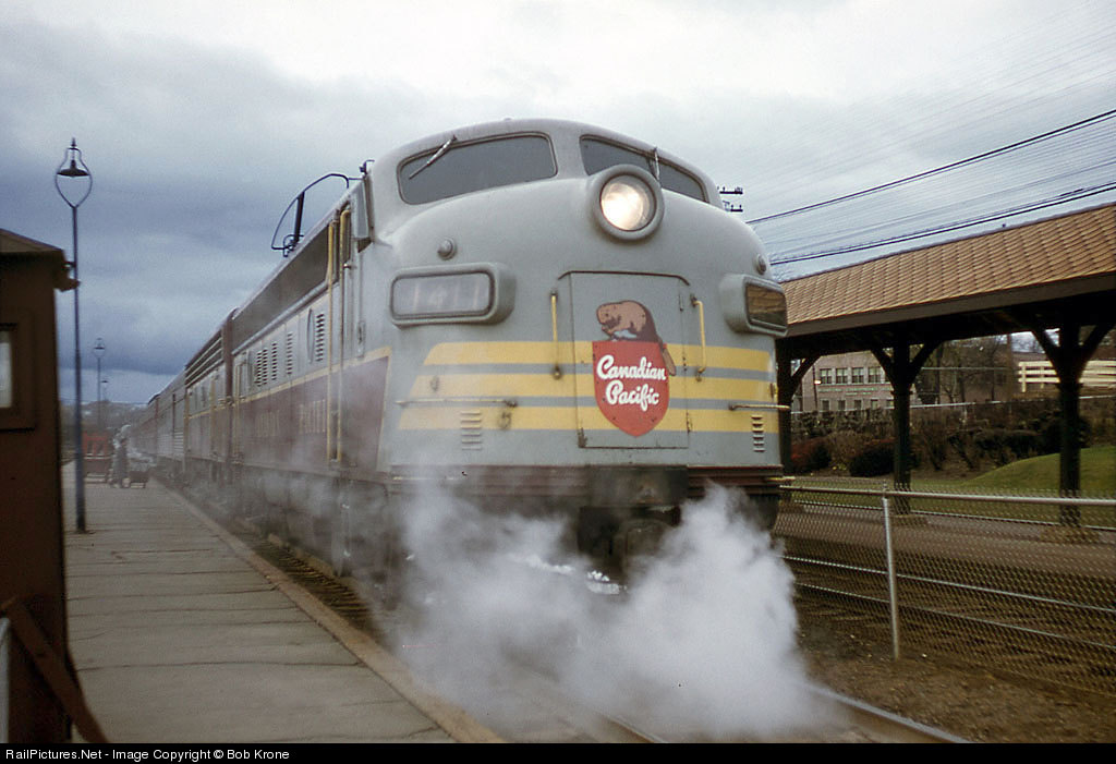 Canadian Pacific train 8, DOMINION, is stopped at Montreal West on the last leg of the journey from the west. The FP9 exhibits the hoops installed on the roof to break icecicles in tunnels and protect the vista dome glass on this train and the CANADIAN.