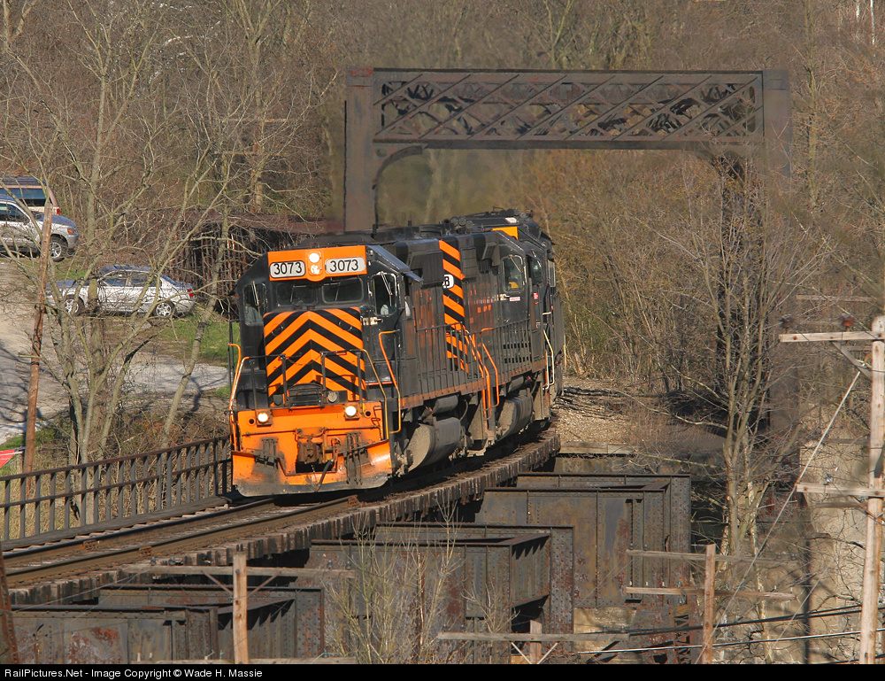 | One of the best Wheeling lashups I've ever seen makes its way across the truss bridge in Morgan. 3073 is trailed by the 3048, 5413, and the 105. |