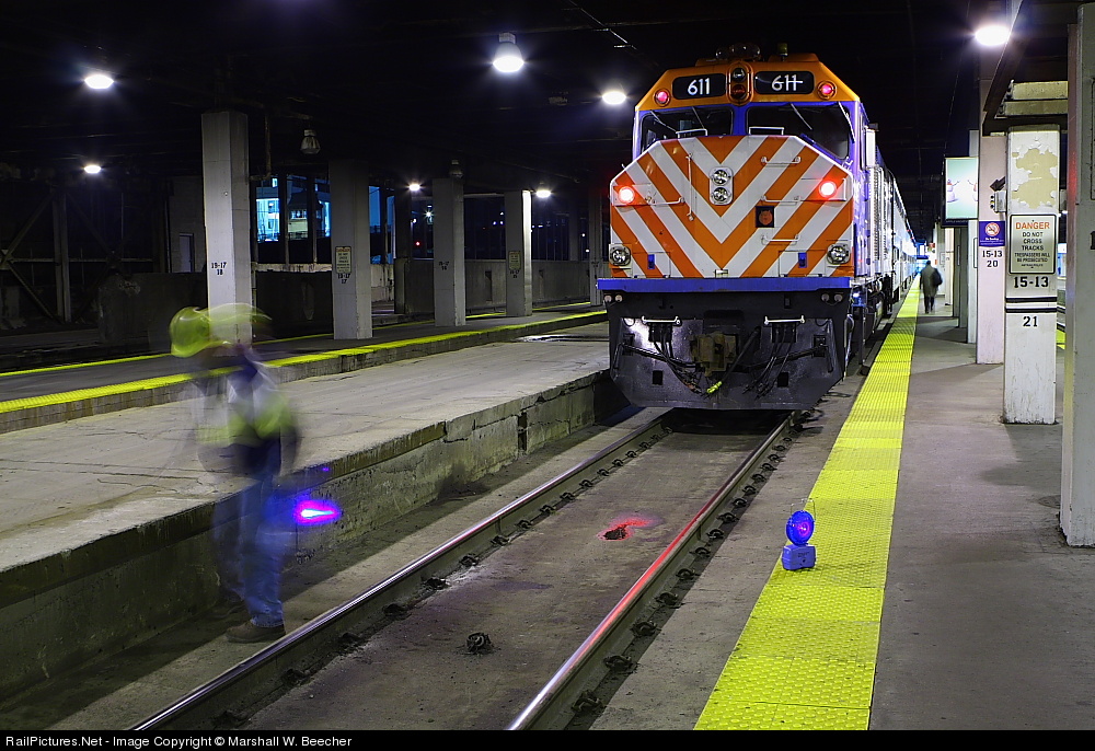 | Preparing for an on-time departure for Fox Lake, the CUS carman takes down their Blue Flag Protection as one of Metra's Diesel Dinosaurs looks on. Recent power shortages due to rebuildings on F40PH's and return warranty work on MP36's have brought the 2 remaining F40C's back into service for the near future. Get your shots while you can! |