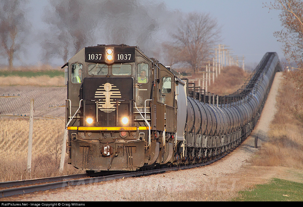 | A loaded ethanol train makes its way east towards Chicago on this early Wednesday morning. The train is working over all the hogbacks on the Dubuque Sub east of Waterloo. This train was loaded at Arthur, IA, which is 63 miles west of Ft Dodge on the Ida Grove Sub. A somewhat unusual consist of 2 IC SD70's power this 75 car train today. |