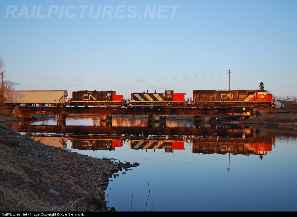CN 437's variety of power reflects nicely off the McIntryre River at the last light of the day