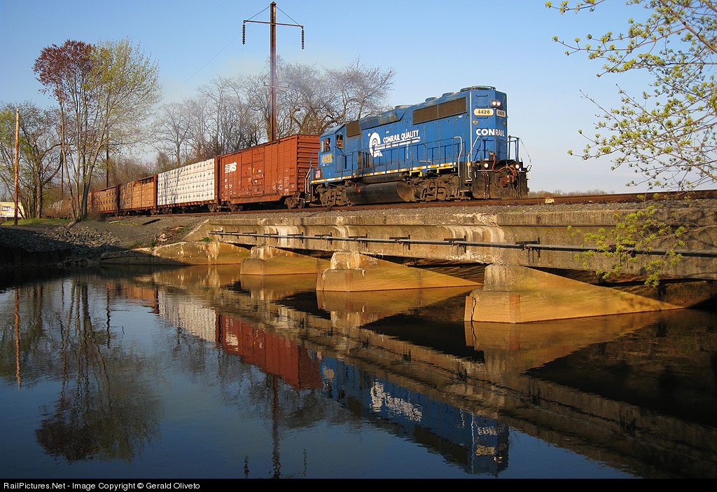 | With a lengthy consist in tow, GP40-2 no. 4428 still in its Conrail paint heads west en route to Dayton. The train is seen here crossing the South River at East Brunswick on the former Pennsylvania Railroad Amboy Secondary. |