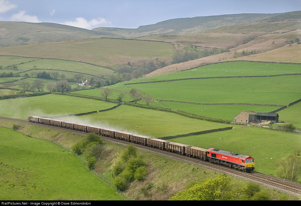 | Loaded boxes make their way east through Edale from Peak Forest, headed by the uniquely liveried 66152, the easterly wind blowing the stone dust back up the valley. |