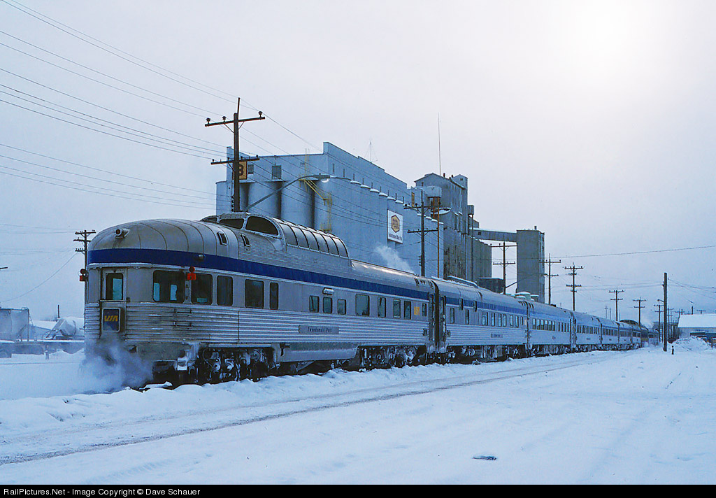 | Only someone from Minnesota would take Christmas break to railfan in Canada. It was mighty cold, but I wanted to shoot the Canadian before it was routed off the CP. Here the westbound train departs Thunder Bay with the park series dome observation car Tweedsmuir Park bringing up the rear. |