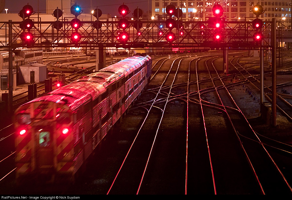 | An outbound Metra run heading for Manhattan, IL on the Southwest Service roars out of Union Station. The conductor has just begun collecting tickets and is silhouetted in the rear window of the train as it picks up speed on this wide expanse of track. |