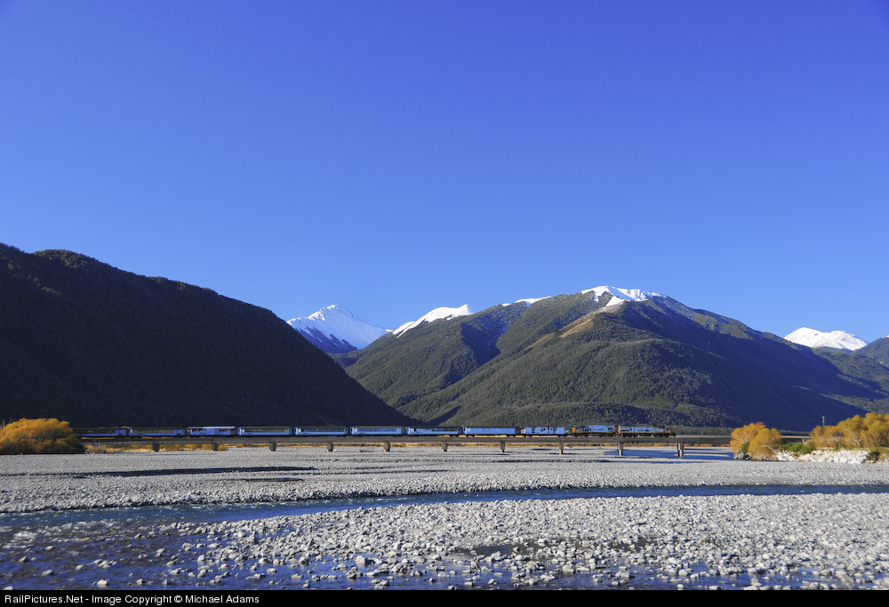 Running slightly ahead of schedule, a matching pair of TranzRail livery locos cross the Waimak River on the Midland Line. Fresh snow, pristine weather and the rapidly approaching Autumn make for a beautiful scene.