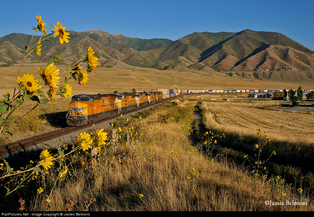 Framed by a grouping of summer sunflowers, a Union Pacific stack train cruises east down the Lynndyl Subdivision just east of Erda, Utah. Hints of autumn color are beginning to show along the foothills of the nearby Oquirrh Mountains.