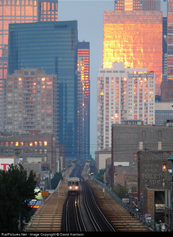 A westbound Green line train, in the middle of a nonstop run of over a mile between Clinton and Ashland stations, seems to be fleeing from the downtown buildings ablaze at sunset.