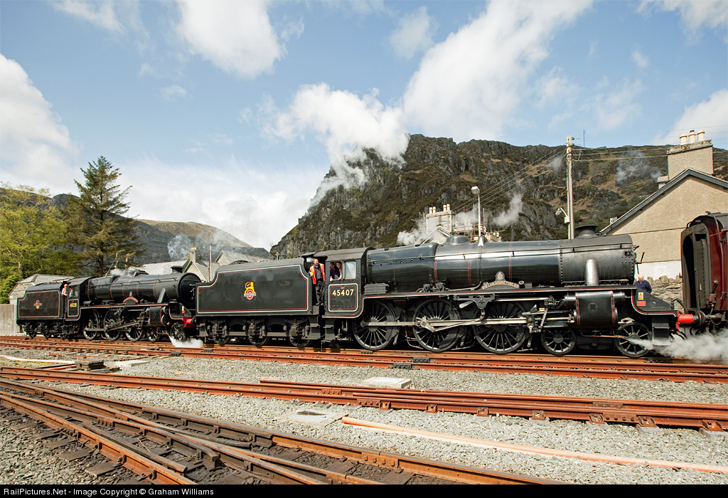 | Black Fives nos. 45407 and 45231 at the head of the train ready to depart from Blaenau Festiniog, running in reverse with the "Welsh Mountaineer" main line special. |