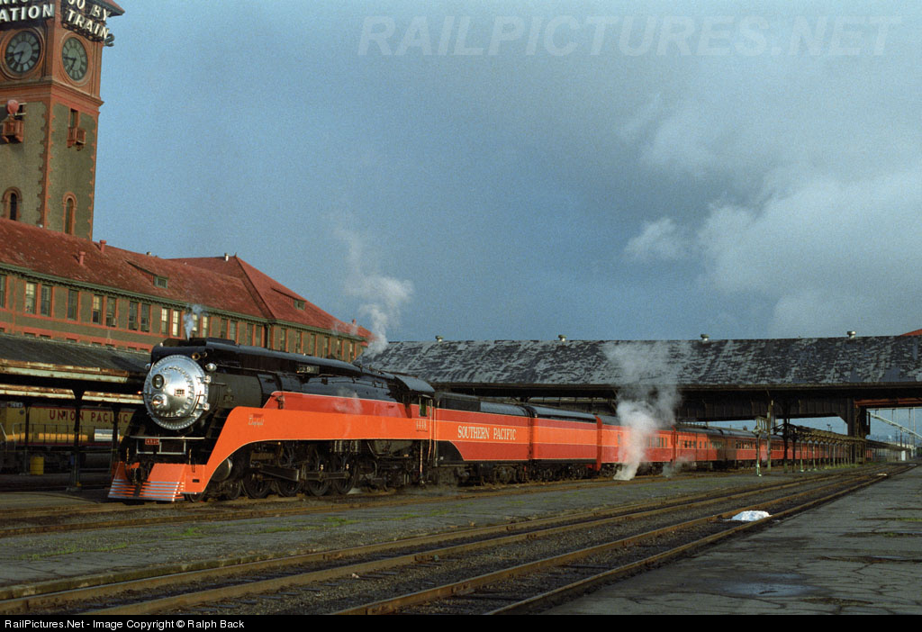 1984 LOUISIANA WORLD'S FAIR DAYLIGHT. The Union Station clock tower shows 6:44AM as SP 4449 and its 13-car all Daylight consist sit unattended waiting for its departure to New Orleans, LA and the 1984 Louisiana World's Fair. SP 4449 is displaying the number "9" in its train indicator board for Train No. 9 the southbound Shasta Daylight for the leg from Portland, OR to Sacramento, CA. At this time, SP 4449's tender was lettered with the large 1946 SP common standard 20" Roman "SOUTHERN PACIFIC" lettering in the orange band in the middle of the tender.