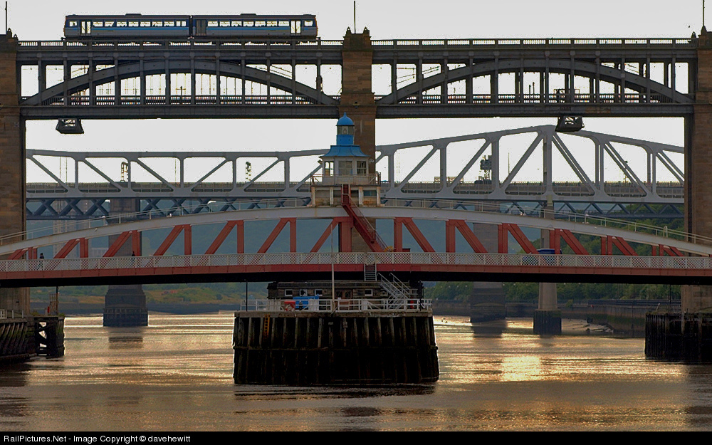A Pacer unit heads for Sunderland over the 1849 built High Level bridge crossing the river Tyne. Also in shot are the 1872 swing bridge and the 1982 metro bridge.