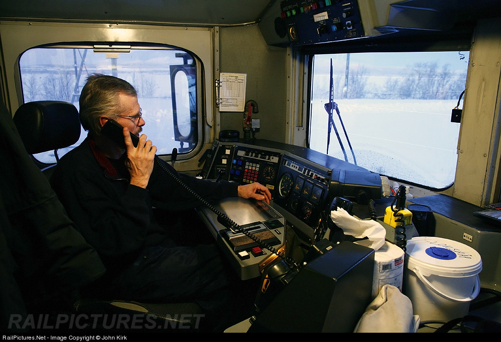 | Inside the warmth of DM3 1210’s cab, Driver Lennart Antonsson talks to the controller before starting his load of iron iron on its journey through the Arctic mountains and fjords to the port of Narvik in Norway. The venerable DM3’s coupled wheelsets set up a rocking movement like a steam locomotive so the contol panel is attached to the driver’s air cushion seat and moves independently of the locomotive. All made for a fascinating cab ride in Nov 2007. |