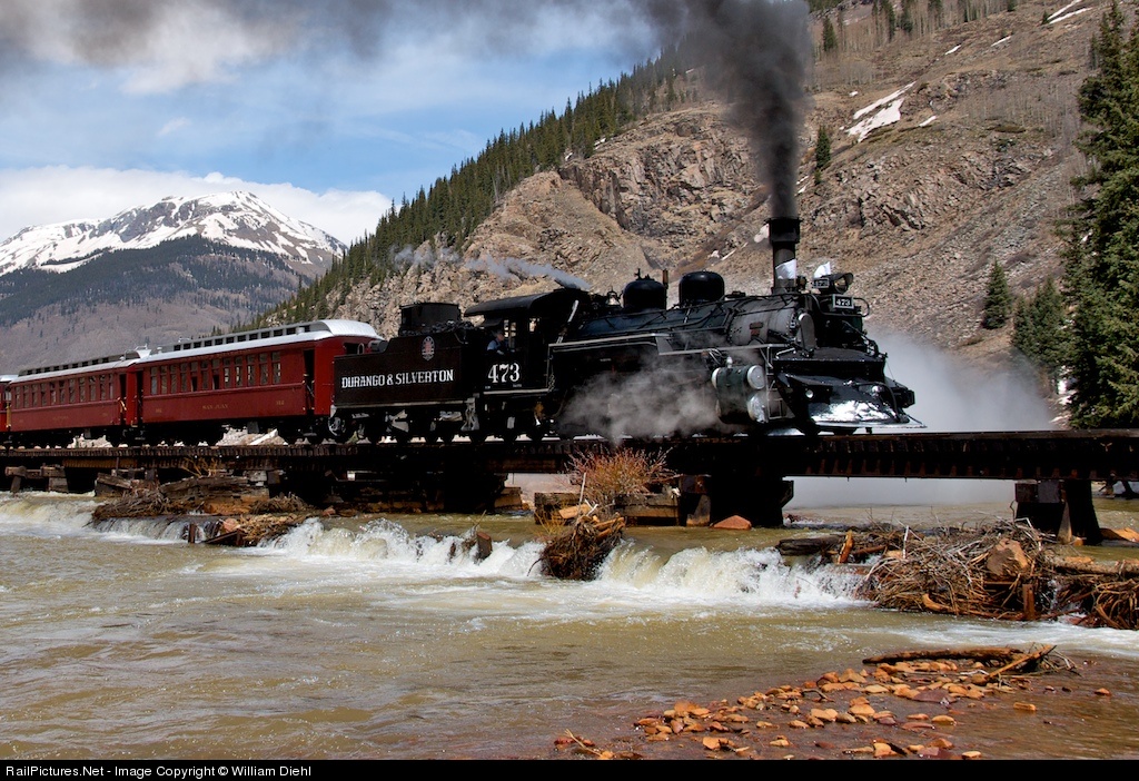 | D&SNG 473 Pulls the Presidential Special photo train across the Animas river on the south end of Bakers Park.