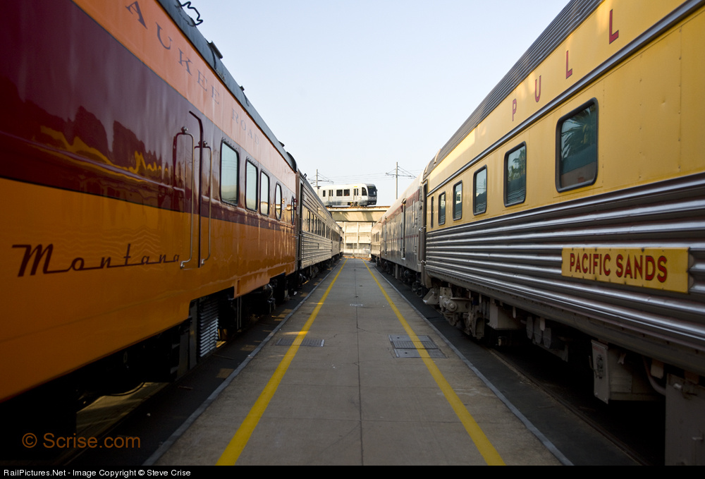 | Private varnish passenger cars Montana and Pacific Sands rest along with other stored private cars at the Garden Tracks near the Los Angeles Union Passenger Terminal in Los Angeles, Calif. One of MTA’s newer Breda LRV cars is visible making its way into Union Station on the Gold Line from Pasadena. May 9th, 2009. Steve Crise Photo, © 2009 Scrise.com |