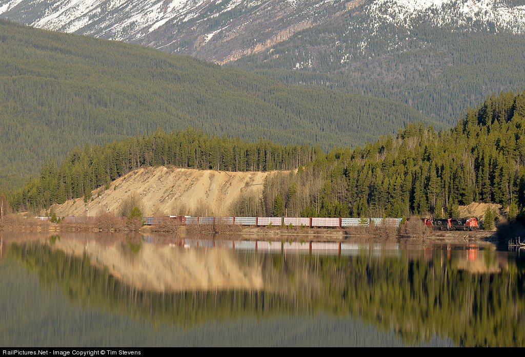 CN 8851, CN 2294 and CN 5716 lead M304's train along the shores of Yellowhead Lake.