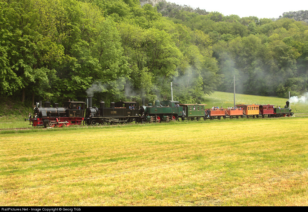 The little tank engine E 3/3 1 (J.A.Maffei 1909) of the Oensingen-Balsthal-Bahn is leading a unique train of vintage vehicles from Oensingen to Balsthal. Other locos are Eb 2/4 35 of the former Jura-Simplon (Esslingen 1891), Ed 2x2/2 196 of the former Centralbahn (Maffei 1893) and Ec 2/5 28 GENF of the Engerth design (Esslingen 1858), the cars are replicas (built 1947) of the SNB (Schweizerische Nord Bahn, Zürich - Baden) of 1847.