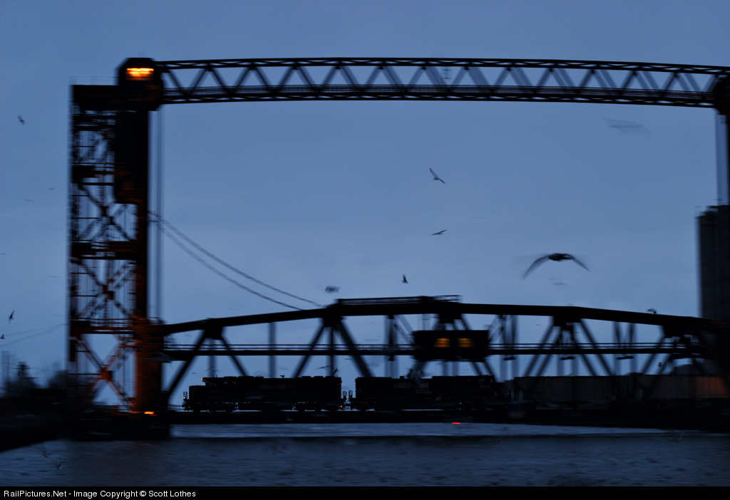 Westbound Norfolk Southern mixed freight crossing the mouth of the Cuyahoga River in Cleveland, Ohio, as blue dusk falls on a gray winter day and seagulls search for food.