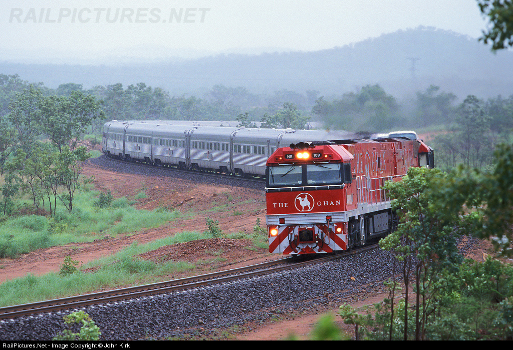 | Captured during a teeming tropical downpour, the second Ghan service from Adelaide to Darwin hauled by locos NR109 and NR74 in Ghan colors, rounds the curves near the Fergusson River on 11.2.2004 |