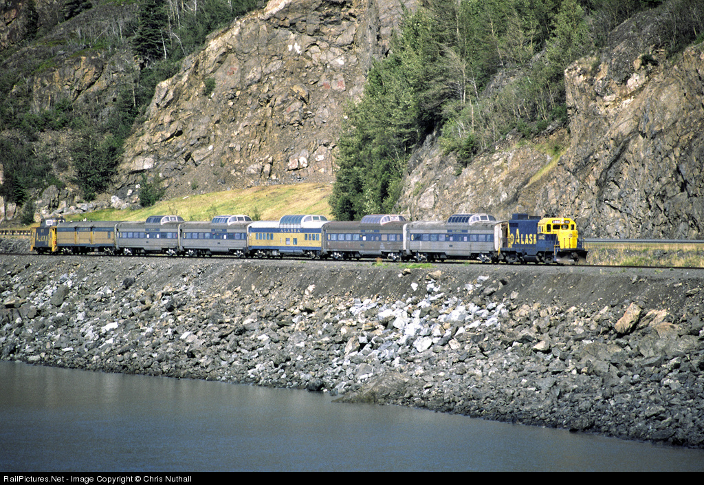 Following the Seward Highway along the Turnagain Arm, 1802 and domes heads towards Portage, from Anchorage, to pick up a string of flat cars to form the Whittier Shuttle in August 1985. The photographer had the wonderful experience of riding 1802 from Portage to Whittier and back on this day. History is repeating itself today as the shuttle is back in action after the road to Whittier, built some time after this photograph, was recently blocked by a rockfall.