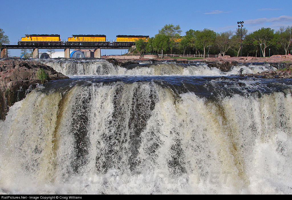 | The D&I's rock train is about to stop at the diamonds in downtown Sioux Falls as they past over the famous falls. The train is operating over the BNSF Madison Branch and will then operate over BNSF Canton Sub to Canton, SD before returning back to home rails. 4 SD's is powering this 95 car train today out of Dell Rapids, SD. |