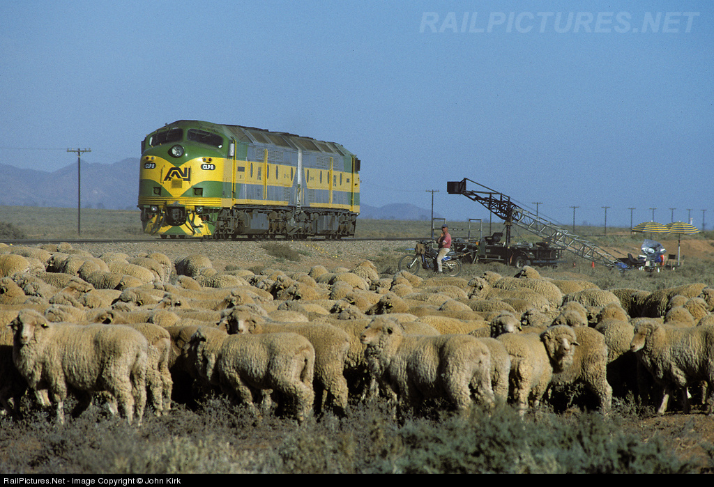 | “Marlboro Country revisited!” CLPs 8 & 14 in AN passenger scheme star in a Japanese cigarette commercial with 3,000 sheep as extras! The shoot took place near Wilkatana on the remote Marree line, now the coal line to Leigh Creek. During a break in filming, the “shepherd” on the bike keeps an eye on the sheep who don’t seem to care too much about anything really. The passenger consist was detached for this part of the shoot. (AT26C rebuilt as AT26HC-2M)