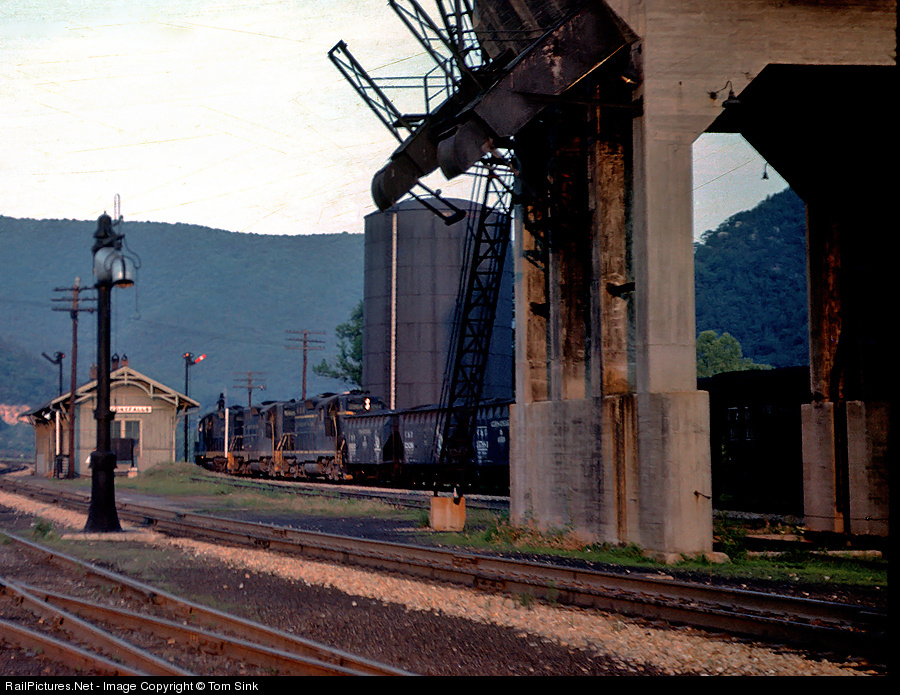 Eastbound coal loads passing the depot and coal tower at Balcony Falls in July 1961.