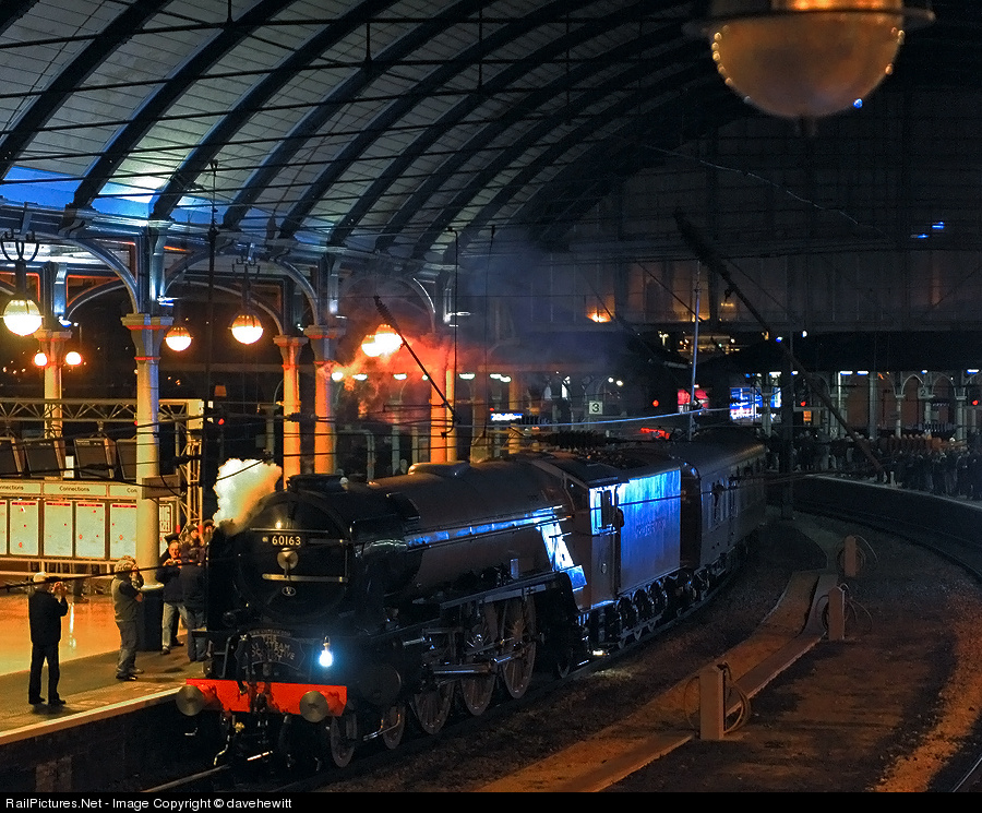 | The locomotive Tornado, before it had its first main line outing made a series of tests runs. Here it arrives at Newcastle from York with an evening train . Still in its undercoat of grey paint it would be several weeks before it would receive its green coat |