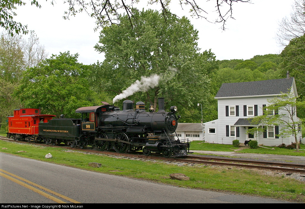 Classy number 98 poses with a caboose hop at Ashland. Built in 1909, #98 is 100 years old this year. The great looking loco has 69" drivers, 19x26" cylinders, and makes 23,450 lbs of tractive effort. She's the pride of the WWRR crew and the local residents.