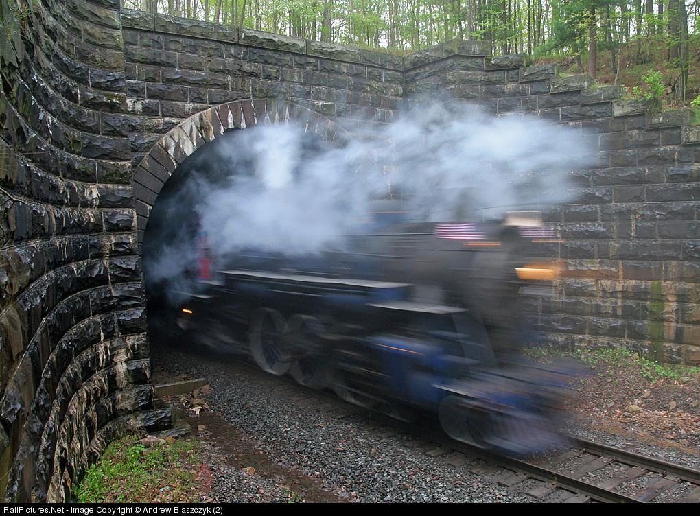 | RBMN 425 roars, literally, out of White Haven Tunnel in a cloud of fog, steam and smoke. |
