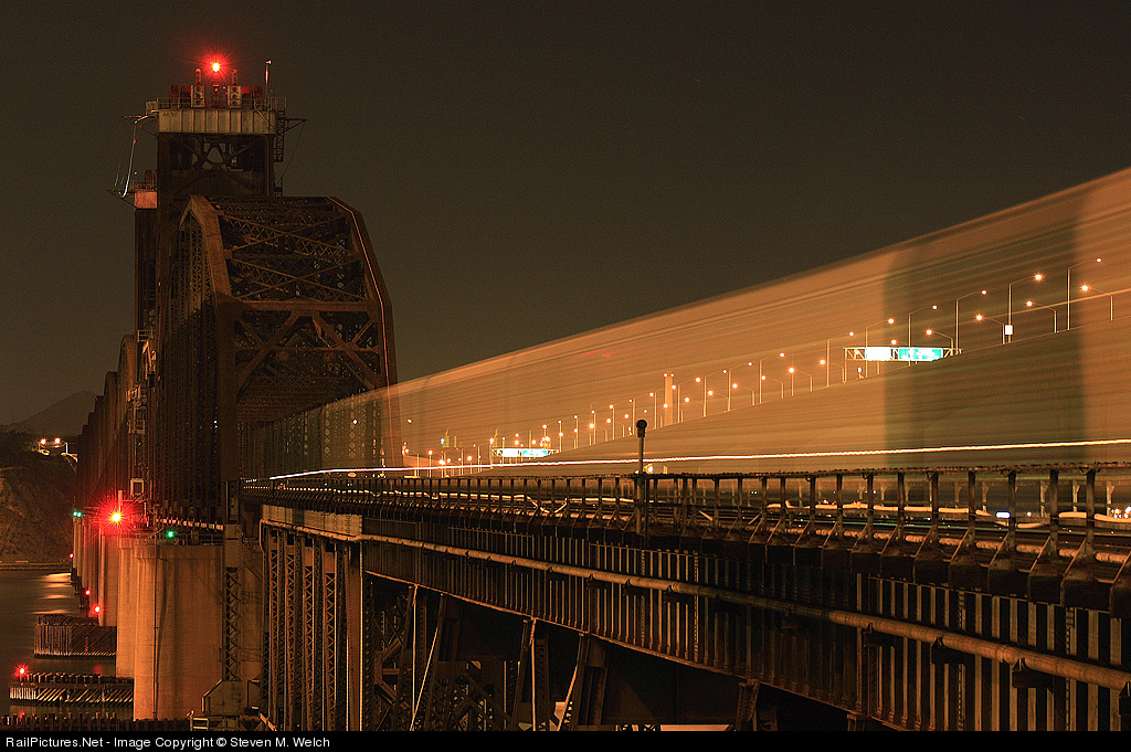 On a warm Spring evening, an Eastbound autotrain crosses the Benicia Bridge under the cover of darkness.