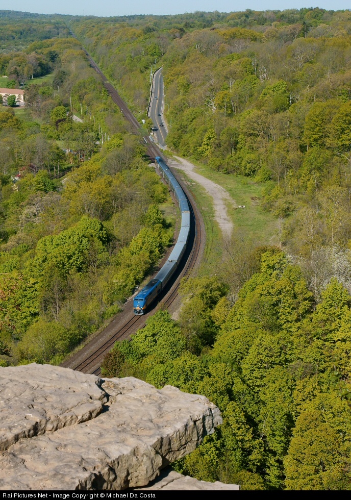 Overlooking the breath taking view from the bluff a top Dundas Hill, we see a westbound VIA 671 climbing the 1% 10 mile Copetown Hill with ease.