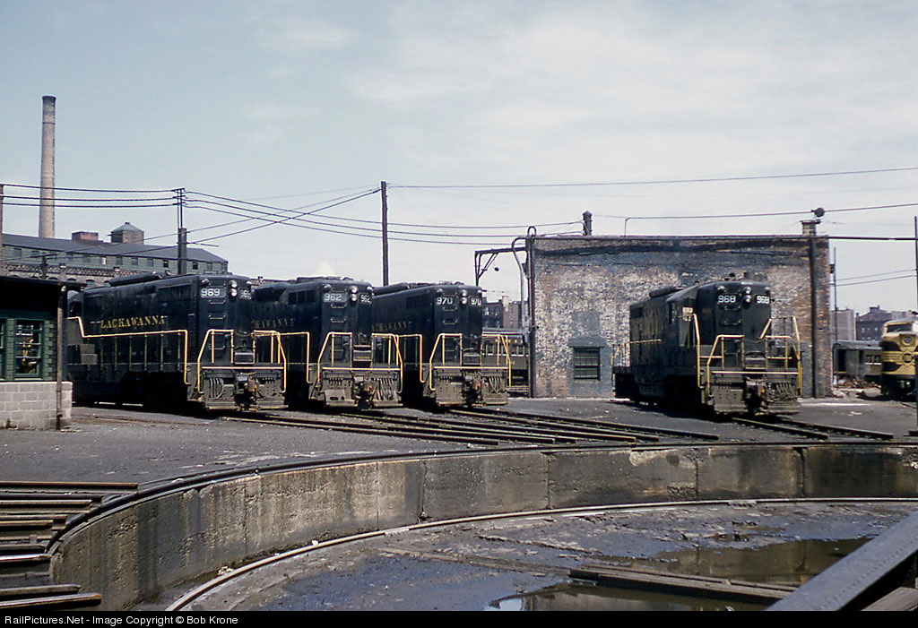 | Four Lackawanna GP7s sit around the Hoboken turn table. One unit, 962, is a freight Geep and has dynamic brakes. |