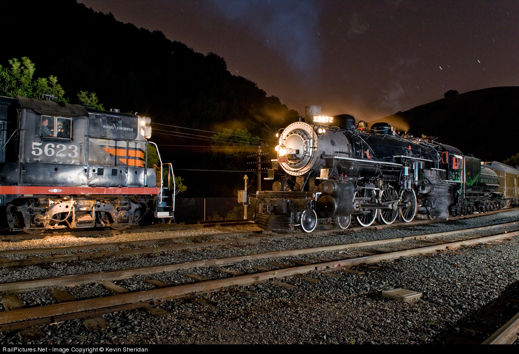 | Southern Pacific P8 Pacific 2472, and GP-9 5623 at the Niles Canyon Railway's Brightside yard. This staged set up was part of a Night Photography Session held by the Golden Gate Railroad Museum and Vic Neves. |