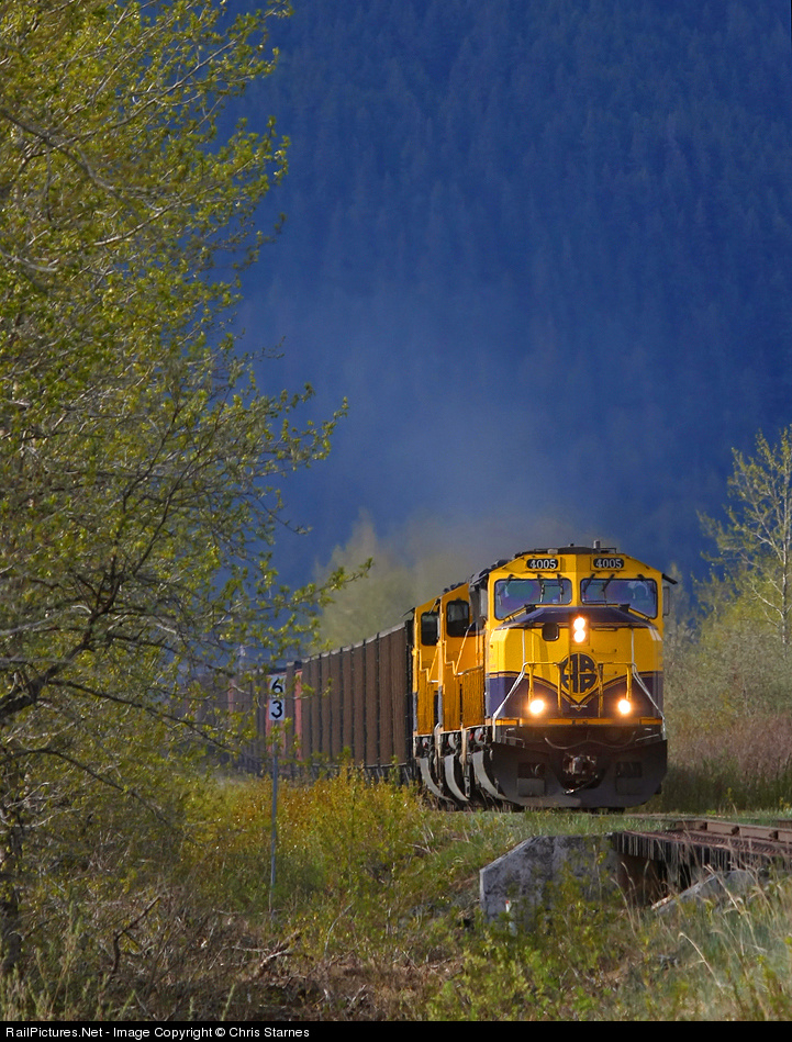 Three Alaska RR SD70MACs (plus one more in DP mode on the rear) lead a southbound loaded coal train through Portage enroute to Seward for export to Asia. These export coal trains load at Healy on the north end of the railroad and make the 700+ mile round trip to Seward twice a week. The 50-mile stretch between Anchorage and Portage becomes quite busy during the summer with a mix of these coal trains, interchange barge freight traffic, and the normal passenger operations. Click here to view a video of this train.