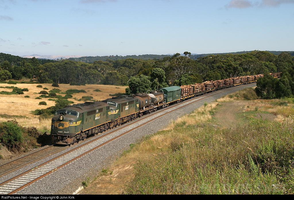 A78/A71 still in Freight Australia paint, struggle up Warrenheip bank with #9230 log train from Bairnsdale to Geelong diverted via Ballarat and Warrenheip. The diversion was required while the Ballarat line was upgraded for the Regional Fast Rail project. Note the Merry Xmas sign taped on the front of A78 (EMD ML2 rebuilt as AAT22C-2R)