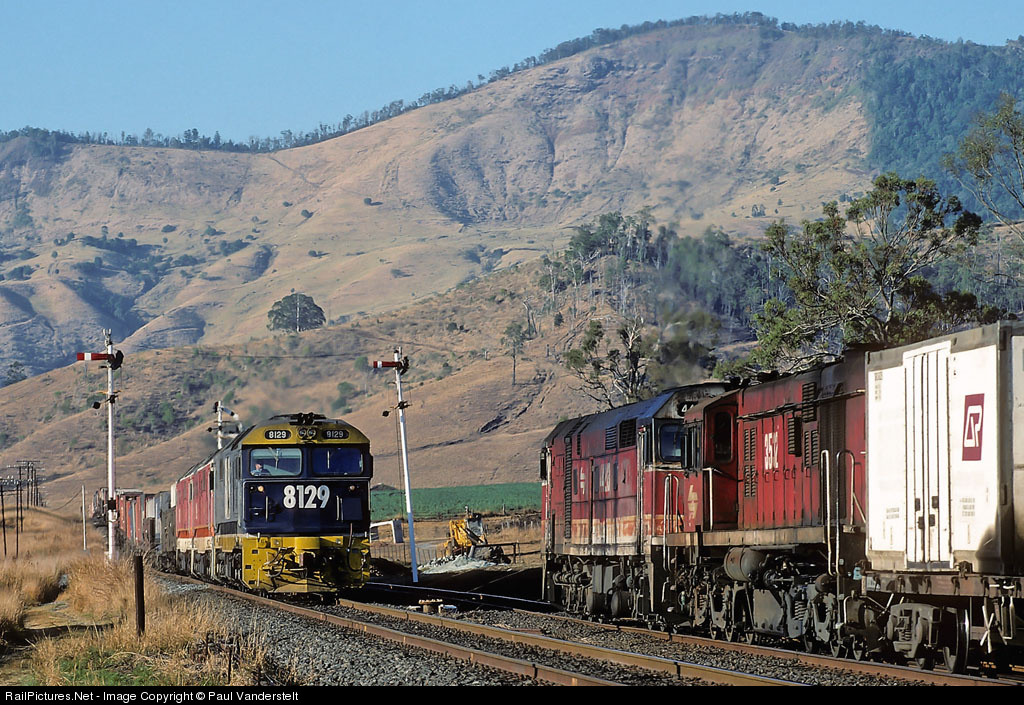 | The changing of the guard.For more than 2 decades ALCO had been the sole type of horsepower found on the North Coast line in & out of Brisbane.With the immanent withdrawal date closing in, EMD horsepower was quickly taking over.By September 1994 only a few ALCO's were still running on the Coast Line.The 2nd last Brisbane (Acacia Ridge yard) Alco shunt engine 3532 trails 44213 on 7BS6 freight & have stopped in the loop at Glenapp to allow 8129,8146 & 8169 on 6SB7 through on the main as they head for Brisbane. |