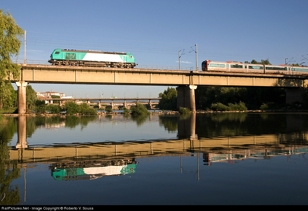 | CP 2240 (public company), and vossloh locomotive, in Takargo service (private company), passing the Mondego river.