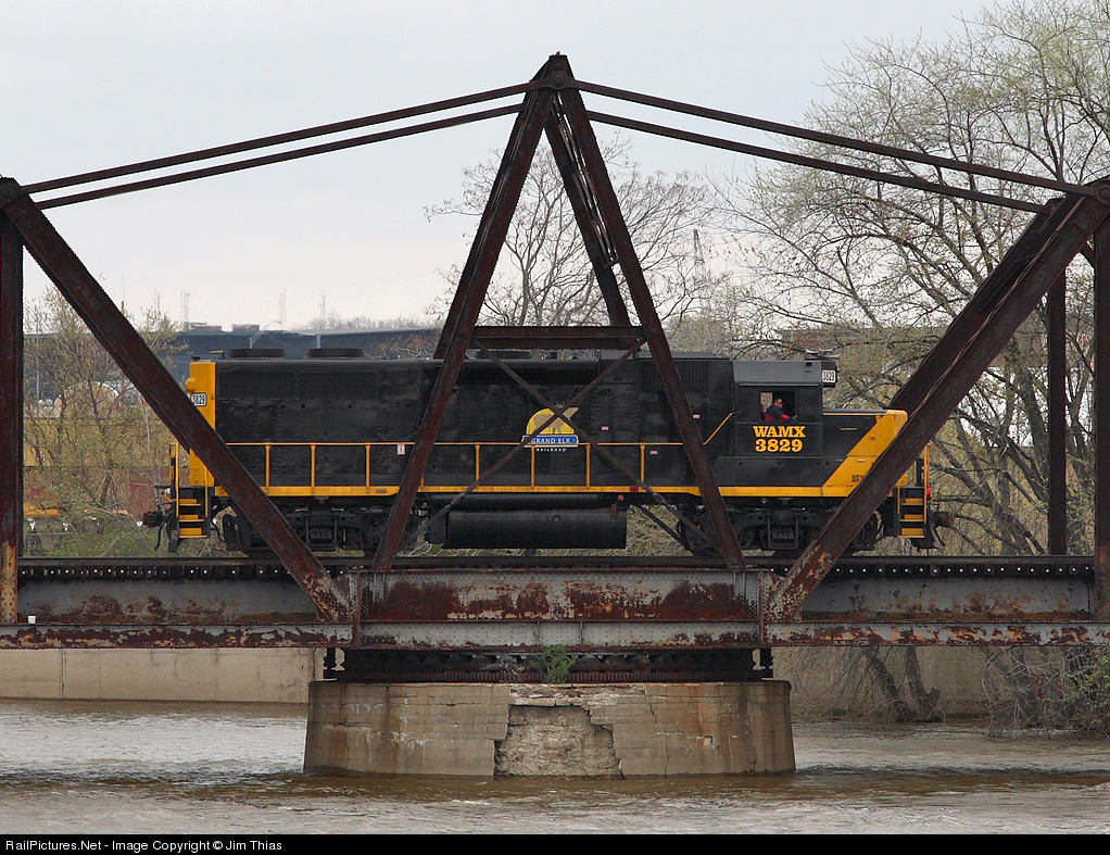 | Grand Elk Railroad's 3829 rolls slowly across the historic swing bridge over the Grand River after finishing up a switching job. Although the gears of the swing mechanism are still visible, the bridge probably hasn't been opened for a boat in over half a century. Incidentally, this is the first photo of a Grand Elk Railroad locomotive to see RP. :-) |