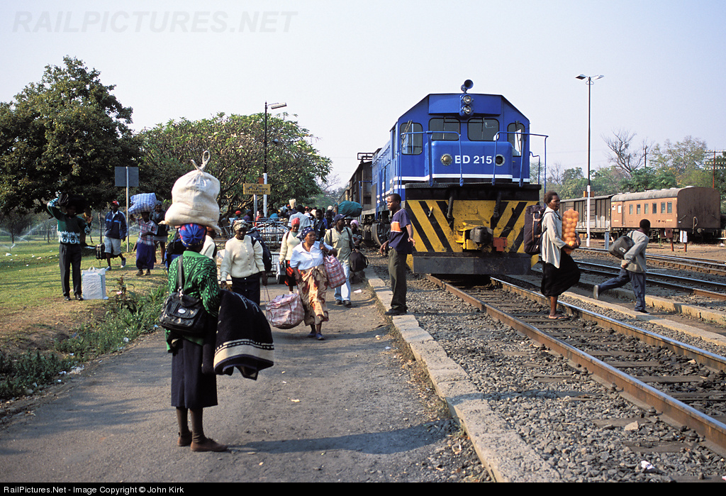 | Passengers carrying all manner of luggage by hand and on the head depart from Victoria Falls Station after the arrival of BD215 with a Zimbabwe Railways passenger service from Bulowayo. A diligent railway employee tries valiantly to encourage people to cross the tracks at the marked crossing. I'm not sure I would be as relaxed wandering around this area today as I was back in 2002. |