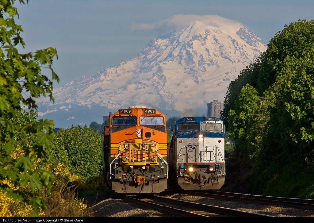 Finally! I caught a second train in good light at this location. And this was the second chance, the first spoiled by the open door of a very late Cascades 516, featuring another P32, AMTK 509. Now Cascades 509 featuring AMTK 505 (how do they keep this stuff straight?) passes the DPU of a grain train waiting to put it's train at TEMCO, just around the corner, but still under the watchful gaze of Mt. Rainier.