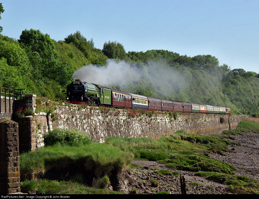 | Now fully operational in its LNER Apple Green livery 60163 'Tornado' heads down the Severn Estuary with the 1Z27 'Severn Coast Express' 0802 Gloucester - Cardiff with DBS Class 67 67002 'Special Delivery' on the rear. |