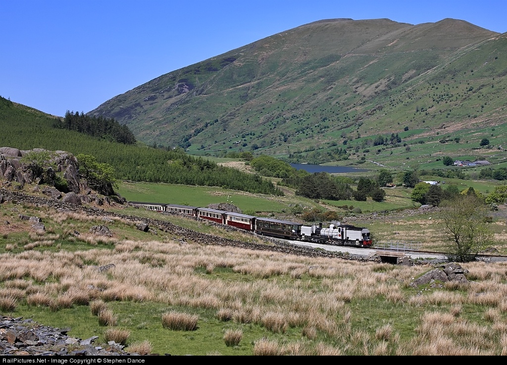 | Welsh Highland Beyer-Garratt 2-6-2+2-6-2T number 87 descends from Rhyd Ddu round the curve at Ffridd-isaf. The first vehicle is the WHR's new Pullman observation car which was beautifully fitted out by the Ffestiniog's Boston Lodge works from a frame supplied by an external contractor. Number 87 is coal fired, was built in Belgium in 1936 and spent its working life in South Africa before moving to the UK as part of the abortive Robin Hoods Bay scheme. The Welsh Highland acquired her from there as a result of a private donation and she entered service in 2009 following overhaul at Boston Lodge. The line swings round from here and continues across the lower reaches of Moel Eilio in the background |