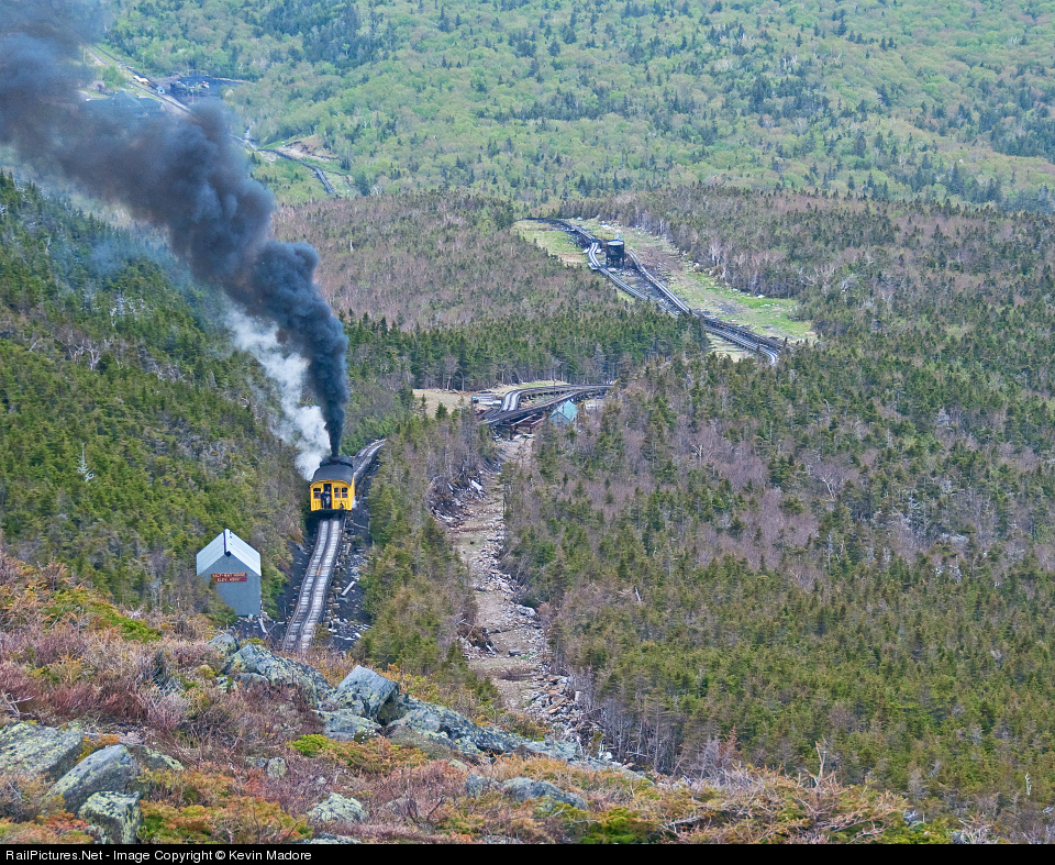 From a bluff near Jacob's Ladder, we watch a Mount Washington Cog Railway Train powering uphill toward the Halfway House at 4,500 ft MSL. This perspective offers not only a not-often-seen view of an ascending train, but of much of the lower half of the railroad as well. In the center of the photo, we can see the hydraulically-actuated switches above Waumbek Tank. Following the line downhill, we can see the parallel passing tracks that lead to the Waumbek Water Tank itself. Just below the tank, the tracks merge at another switching station. Just above the smoke plume is the coaling pit located at Marshfield Station, where all trips originate. Speaking of the smoke plume, that's known by the local tree-huggers as "Cog Smog".